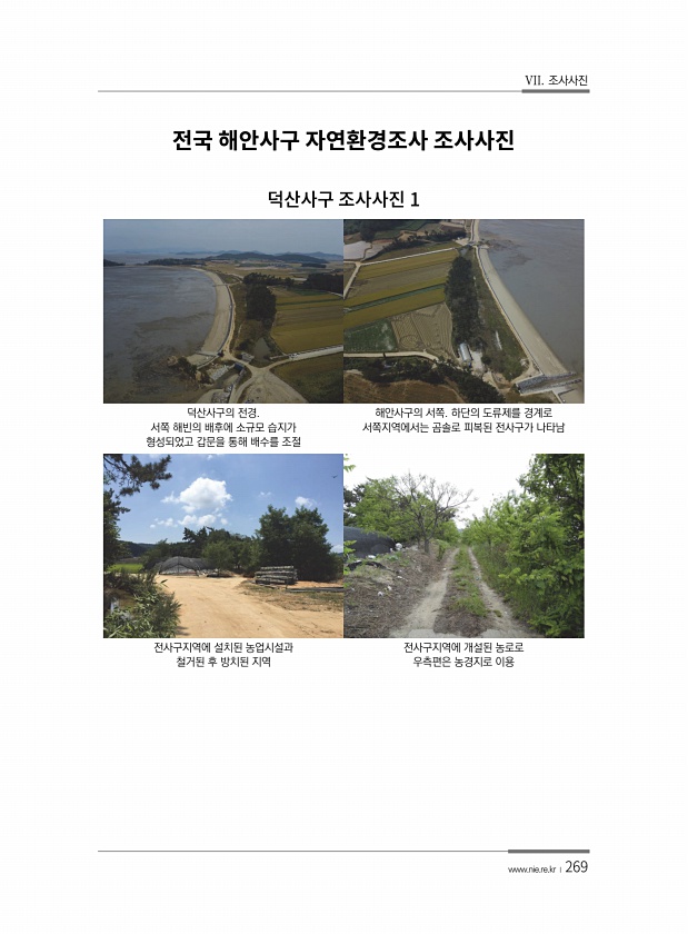VII. 조사사진 www.nie.re.kr ?269 덕산사구의 전경. 서쪽 해빈의 배후에 소규모 습지가 형성되었고 갑문을 통해 배수를 조절 해안사구의 서쪽. 하단의 도류제를 경계로 서쪽지역에서는 곰솔로 피복된 전사구가 나타남 전사구지역에 설치된 농업시설과 철거된 후 방치된 지역 전사구지역에 개설된 농로로 우측편은 농경지로 이용1