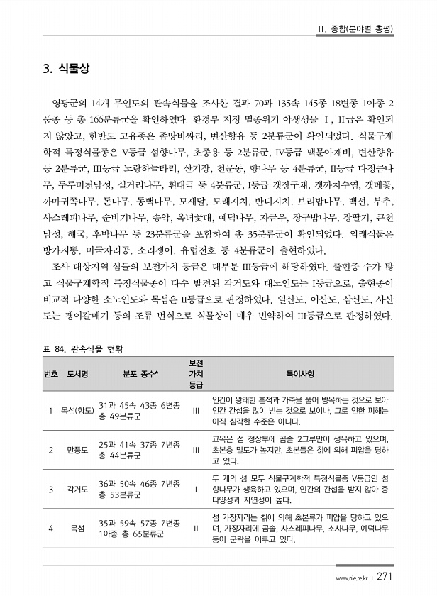 Ⅲ. 종합 분야별 총평 www.nie.re.kr ? 271 번호 도서명 분포 종수* 보전 가치 등급 특이사항 1 목섬 항도 31과 45속 43종 6변종 총 49분류군 III 인간이 왕래한 흔적과 가축을 풀어 방목하는 것으로 보아 인간 간섭을 많이 받는 것으로 보이나, 그로 인한 피해는 아직 심각한 수준은 아니다. 2 만풍도 25과 41속 37종 7변종 총 44분류군 III 교목은 섬 정상부에 곰솔 2그루만이 생육하고 있으며, 초본층 밀도가 높지만, 초본들은 칡에 의해 피압을 당하 고 있다. 3 각거도 36과 50속 46종 7변종 총 53분류군 I 두 개의 섬 모두 식물구계학적 특정식물종 V등급인 섬 향나무가 생육하고 있으며, 인간의 간섭을 받지 않아 종 다양성과 자연성이 높다. 4 목섬 35과 59속 57종...