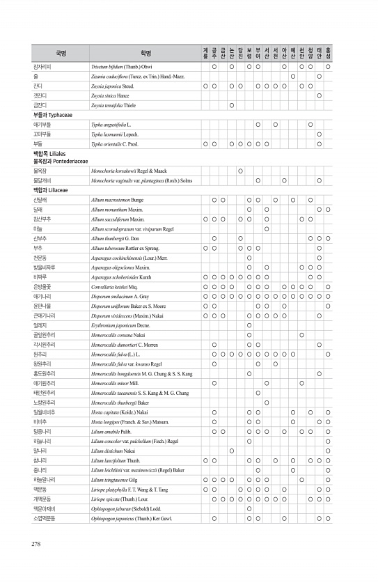 278 잠자리피 Trisetum bifdum Thunb. Ohwi ○ ○ ○ ○ ○ ○ ○ ○ 줄 Zizania caducifora Turcz. ex Trin. Hand.-Mazz. ○ ○ 잔디 Zoysia japonica Steud. ○ ○ ○ ○ ○ ○ ○ ○ ○ ○ 갯잔디 Zoysia sinica Hance ○ 금잔디 Zoysia tenuifolia Thiele ○ 부들과 Typhaceae 애기부들 Typha angustifolia L. ○ ○ ○ 꼬마부들 Typha laxmannii Lepech. ○ 부들 Typha orientalis C. Presl. ○ ○ ○ ○ ○ ○ ○ ○ 백합목 Liliales 물옥잠과 Pontederiaceae 물옥잠 Monochoria korsakowii Regel & ...