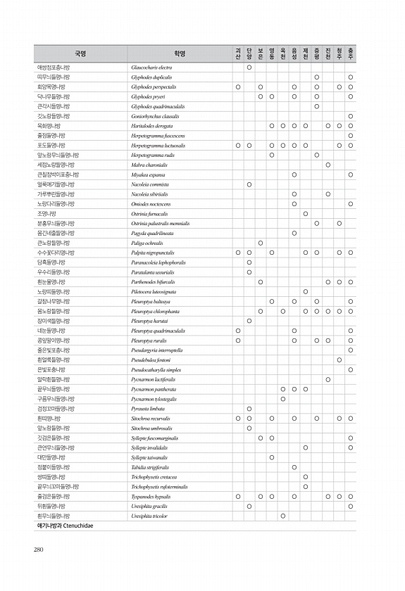 280 애쌍점포충나방 Glaucocharis electra ○ 띠무늬들명나방 Glyphodes duplicalis ○ ○ 회양목명나방 Glyphodes perspectalis ○ ○ ○ ○ ○ ○ 닥나무들명나방 Glyphodes pryeri ○ ○ ○ ○ ○ 큰각시들명나방 Glyphodes quadrimaculalis ○ 깃노랑들명나방 Goniorhynchus clausalis ○ 목화명나방 Haritalodes derogata ○ ○ ○ ○ ○ ○ ○ 줄점들명나방 Herpetogramma fuscescens ○ 포도들명나방 Herpetogramma luctuosalis ○ ○ ○ ○ ○ ○ ○ ○ 앞노랑무늬들명나방 Herpetogramma rudis ○ ○ 세점노랑들명나방 Mabra charonialis ...