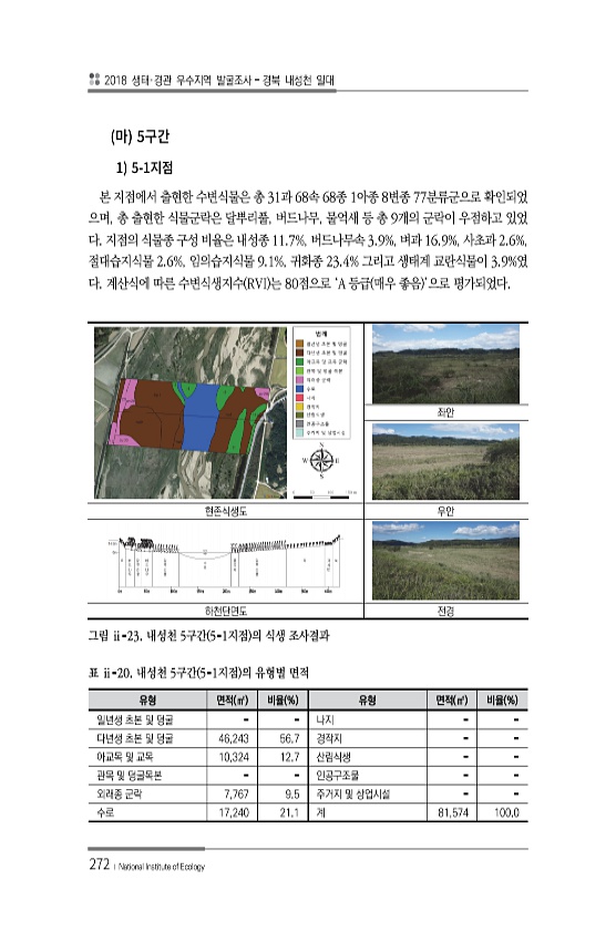 2018 생태·경관 우수지역 발굴조사 경북 내성천 일대 272 ? National Institute of Ecology 5 1 5- 본 지점에서 출현한 수변식물은 총 31과 68속 68종 1아종 8변종 77분류군으로 확인되었 으며, 총 출현한 식물군락은 달뿌리풀, 버드나무, 물억새 등 총 9개의 군락이 우점하고 있었 다. 지점의 식물종 구성 비율은 내성종 11.7%, 버드나무속 3.9%, 벼과 16.9%, 사초과 2.6%, 절대습지식물 2.6%, 임의습지식물 9.1%, 귀화종 23.4% 그리고 생태계 교란식물이 3.9%였 다. 계산식에 따른 수변식생지수 RVI 는 80점으로 ‘A 등급 매우 좋음 ’으로 평가되었다. 좌안 현존식생도 우안 하천단면도 전경 그림 ⅱ-23. 내성천 5구간 5-1지점 의 식생 조사결...