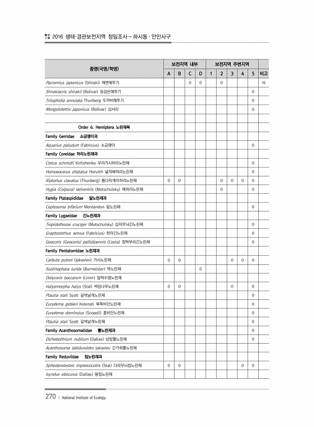 2016 생태·경관보전지역 정밀조사 하시동 · 안인사구 270 ? National Institute of Ecology 종명 국명/학명 보전지역 내부 보전지역 주변지역 A B C D 1 2 3 4 5 비고 Pacromius japonicus Shiraki 해변메뚜기 0 0 0 사 Shirakiacris shirakii Bolivar 등검은메뚜기 0 Trilophidia annulata Thunberg 두꺼비메뚜기 0 Mongolotettix japonicus Bolivar 삽사리 0 Order 6. Hemiptera 노린재목 Family Gerridae 소금쟁이과 Aquarius paludum Fabricius 소금쟁이 0 Family Coreidae 허리노린재과 Cletus schmidti Kiritshe...
