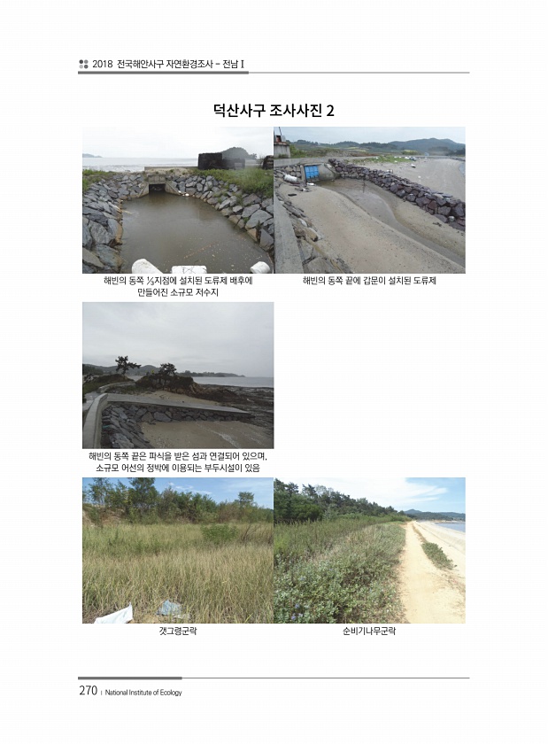 2018 전국해안사구 자연환경조사 전남Ⅰ 270 ? National Institute of Ecology 해빈의 동쪽 ⅓지점에 설치된 도류제 배후에 만들어진 소규모 저수지 해빈의 동쪽 끝에 갑문이 설치된 도류제 해빈의 동쪽 끝은 파식을 받은 섬과 연결되어 있으며, 소규모 어선의 정박에 이용되는 부두시설이 있음 갯그령군락 순비기나무군락2