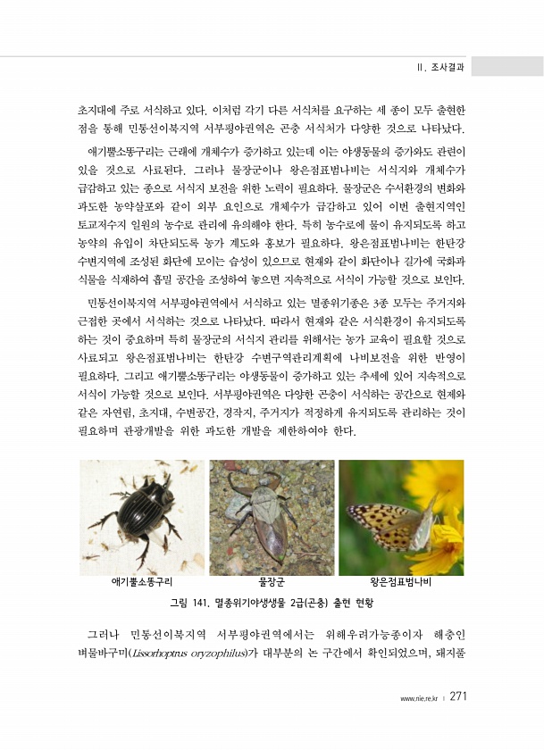 Ⅱ. 조사결과 www.nie.re.kr ? 271 초지대에 주로 서식하고 있다. 이처럼 각기 다른 서식처를 요구하는 세 종이 모두 출현한 점을 통해 민통선이북지역 서부평야권역은 곤충 서식처가 다양한 것으로 나타났다. 애기뿔소똥구리는 근래에 개체수가 증가하고 있는데 이는 야생동물의 증가와도 관련이 있을 것으로 사료된다. 그러나 물장군이나 왕은점표범나비는 서식지와 개체수가 급감하고 있는 종으로 서식지 보전을 위한 노력이 필요하다. 물장군은 수서환경의 변화와 과도한 농약살포와 같이 외부 요인으로 개체수가 급감하고 있어 이번 출현지역인 토교저수지 일원의 농수로 관리에 유의해야 한다. 특히 농수로에 물이 유지되도록 하고 농약의 유입이 차단되도록 농가 계도와 홍보가 필요하다. 왕은점표범나비는 한탄강 수변지역에 조성된 ...
