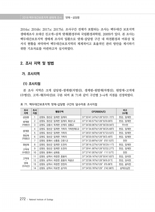 2018 백두대간보호지역 생태계 조사 댓재 삽당령 272 ? National Institute of Ecology 2016a; 2016b; 2017a; 2017b 조사구간 전체가 포함되는 조사는 백두대간 보호지역 생태계조사 오대산 진고개삼척 댓재 환경부와 국립환경과학원, 2009 가 있다. 본 조사는 백두대간보호지역 생태계 조사의 일환으로 댓재-삽당령 구간 내 하천환경과 어류상 및 서식 현황을 파악하여 백두대간보호지역의 체계적이고 효율적인 관리 방안을 제시하기 위한 기초자료를 마련하고자 실시하였다. 2. 조사 지역 및 방법 가. 조사지역 1 조사지점 본 조사 지역은 크게 삽당령-생계령 석병산 , 생계령-원방재 자병산 , 원방재-고적대 수병산 , 고적-재 두타산 로 구분 되며 표 71과 같이 구간별 34개 지...