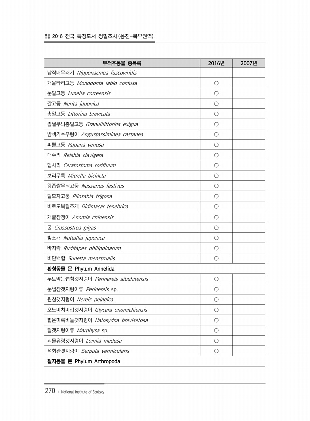 2016 전국 특정도서 정밀조사 옹진-북부권역 270 ? National Institute of Ecology 무척추동물 종목록 2016년 2007년 납작배무래기 Nipponacmea fuscoviridis 개울타리고둥 Monodonta labio confusa ○ 눈알고둥 Lunella correensis ○ 갈고둥 Nerita japonica ○ 총알고둥 Littorina brevicula ○ 좁쌀무늬총알고둥 Granulilittorina exigua ○ 밤색기수우렁이 Angustassiminea castanea ○ 피뿔고둥 Rapana venosa ○ 대수리 Reishia clavigera ○ 맵사리 Ceratostoma rorifluum ○ 보리무륵 Mitrella bicincta ○ 왕좁쌀무늬고둥 ...