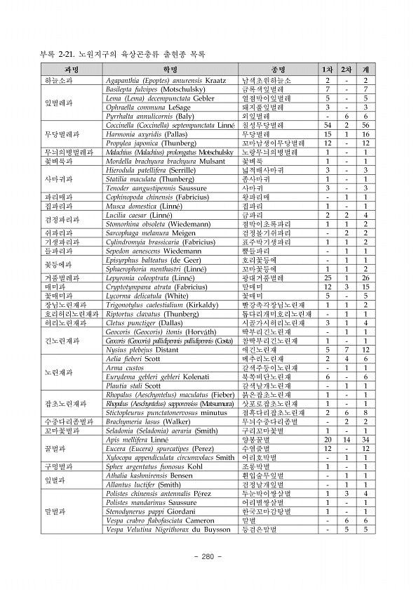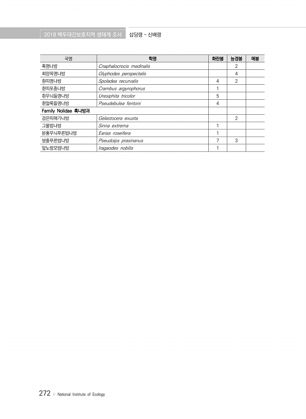 2018 백두대간보호지역 생태계 조사 삽당령 신배령 272 ? National Institute of Ecology 국명 학명 화란봉 능경봉 매봉 혹명나방 Cnaphalocrocis medinalis 2 회양목명나방 Glyphodes perspectalis 4 흰띠명나방 Spoladea recurvalis 4 2 흰띠포충나방 Crambus argyrophorus 1 흰무늬들명나방 Uresiphita tricolor 5 흰얼룩들명나방 Pseudebulea fentoni 4 Family Nolidae 혹나방과 검은띠애기나방 Gelastocera exusta 2 그물밤나방 Sinna extrema 1 분홍무늬푸른밤나방 Earias roseifera 1 쌍줄푸른밤나방 Pseudoips prasinanus 7 3 앞...