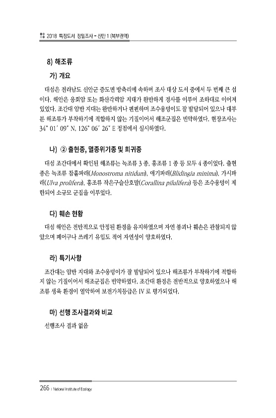 2018 특정도서 정밀조사 신안 1 북부권역 266 ? National Institute of Ecology 8 대섬은 전라남도 신안군 증도면 방축리에 속하며 조사 대상 도서 중에서 두 번째 큰 섬 이다. 해안은 응회암 또는 화산각력암 지대가 완만하게 경사를 이루어 조하대로 이어져 있었다. 조간대 암반 지대는 완만하거나 편편하며 조수웅덩이도 잘 발달되어 있으나 대부 분 해조류가 부착하기에 적합하지 않는 기질이어서 해조군집은 빈약하였다. 현장조사는 34° 01′ 09″ N, 126° 06′ 26″ E 정점에서 실시하였다. , 대섬 조간대에서 확인된 해조류는 녹조류 3 종, 홍조류 1 종 등 모두 4 종이었다. 출현 종은 녹조류 참홑파래 Monostroma nitidum , 애기파래 Blidingia minim...