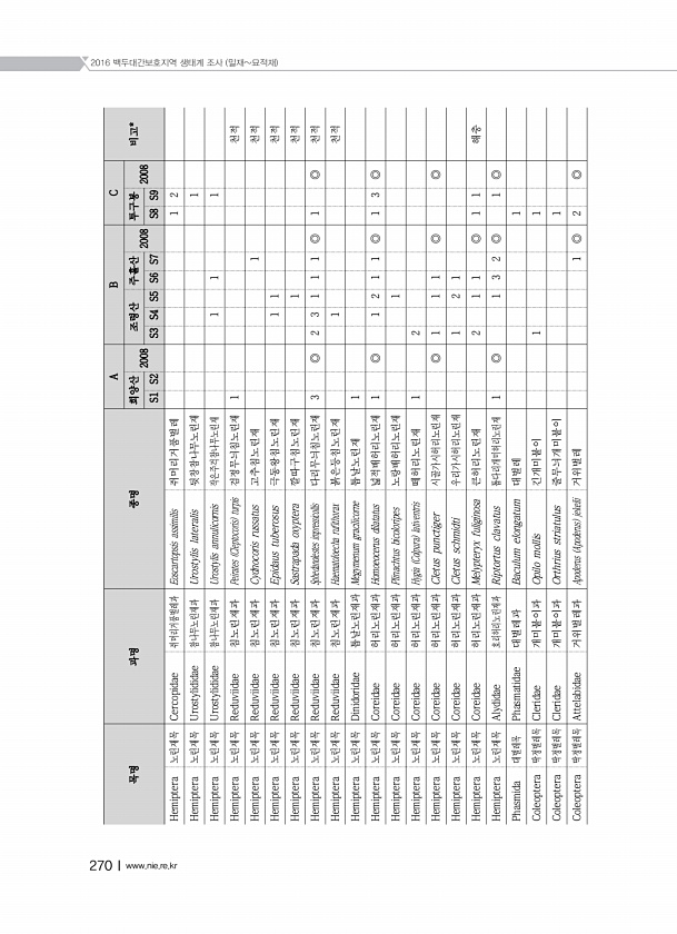 2016 백두대간보호지역 생태계 조사 밀재묘적재 270Ⅰwww.nie.re.kr 목명 과명 종명 A B C 희양산 비고* 2008 조령산 주흘산 2008 투구봉 2008 S1 S2 S3 S4 S5 S6 S7 S8 S9 Hemiptera 노린재목 Cercopidae 쥐머리거품벌레과 Eoscartopsis assimilis 쥐머리거품벌레 1 2 Hemiptera 노린재목 Urostylididae 참나무노린재과 Urostylis lateralis 뒷창참나무노린재 1 Hemiptera 노린재목 Urostylididae 참나무노린재과 Urostylis annulicornis 작은주걱참나무노린재 1 1 1 Hemiptera 노린재목 Reduviidae 침노린재과 Peirates Cleptocoris turpis 검정무...