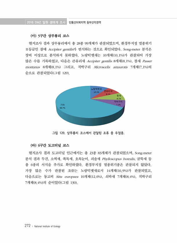2016 DMZ 일원 생태계 조사 민통선이북지역 동부산악권역 272 ? National Institute of Ecology 마 5구간 상무룡리 코스 현지조사 결과 상무룡리에서 총 28종 99개체가 관찰되었으며, 환경부지정 멸종위기 Ⅱ등급인 참매 Accipiter gentilis가 번식하는 것으로 확인되었다. Song-meter 분석은 장비 이상으로 분석하지 못하였다. 노랑턱멧새는 10개체 10.1% 가 관찰되어 가장 많은 수를 기록하였고, 다음은 큰유리새 Accipiter gentilis 8개체 8.1% , 참새 Passer montanus 8개체 8.1% 그리고, 직박구리 Microscelis amaurotis 7개체 7.1% 의 순으로 관찰되었다 그림 129 그림 129. 상무룡리 코스에서 관찰된 조류...