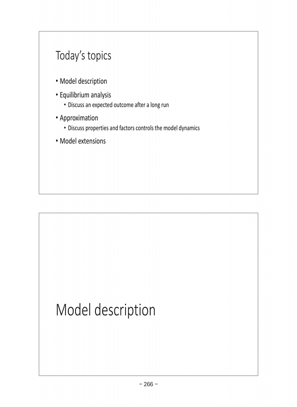 Model description Today’s topics ? Model description ? Equilibrium analysis ? Discuss an expected outcome after a long run ? Approximation ? Discuss properties and factors controls the model dynamics ? Model extensions 266