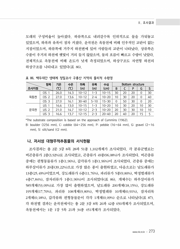 Ⅱ. 조사결과 www.nie.re.kr ? 273 모래의 구성비율이 높아졌다. 하류쪽으로 내려갈수록 인위적으로 물을 가둬놓고 있었으며, 하폭과 유폭이 점차 커졌다. 운곡천은 옥동천에 비해 인우적인 교란이 없는 지점이었으며, 하류쪽에 거주지 하천변에 있어 사람들의 교란이 나타났다. 상류쪽은 수풀이 우거져 하천에 햇빛이 거의 들지 않았으며, 물의 흐름이 빠르고 수량이 낮았다. 전체적으로 옥동천에 비해 온도가 낮게 측정되었으며, 하상구조도 자연형 하천의 하상구조를 나타내고 있었다 표 86 표 86. 백두대간 생태계 정밀조사 구룡산 지역의 물리적 수환경 항목 조사지점 기온 ℃ 수온 ℃ 하폭 m 유폭 m 수심 cm Bottom structure B C P G S 옥동천 OS 1 26.0 14.3 10-12 1-3 1...