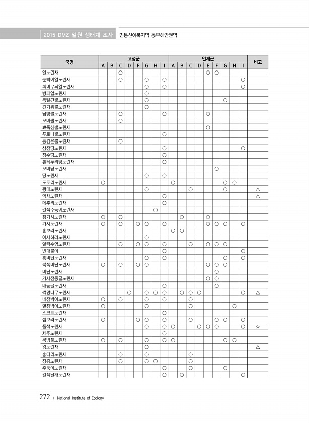 2015 DMZ 일원 생태계 조사 민통선이북지역 동부해안권역 272 ? National Institute of Ecology 국명 고성군 인제군 비고 A B C D F G H I A B C D E F G H I 알노린재 ○ ○ ○ 눈박이알노린재 ○ ○ ○ ○ 희미무늬알노린재 ○ ○ ○ 방패알노린재 ○ 등빨간뿔노린재 ○ ○ 긴가위뿔노린재 ○ 남방뿔노린재 ○ ○ ○ 꼬마뿔노린재 ○ 뾰족침뿔노린재 ○ 푸토니뿔노린재 ○ 등검은뿔노린재 ○ 삼점땅노린재 ○ ○ 장수땅노린재 ○ 흰테두리땅노린재 ○ 꼬마땅노린재 ○ 땅노린재 ○ ○ 도토리노린재 ○ ○ ○ ○ 광대노린재 ○ ○ ○ △ 억새노린재 ○ △ 메추리노린재 ○ 갈색주둥이노린재 ○ 참가시노린재 ○ ○ ○ ○ 가시노린재 ○ ○ ○ ○ ○ ○ ○ ○ ○ 홍보라노린재 ○ ○...
