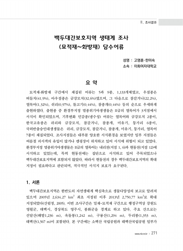 Ⅱ. 조사결과 www.nie.re.kr ? 271 백두대간보호지역 생태계 조사 묘적재화방재 담수어류 성명 고명훈·한미숙 소속 이화여자대학교 요 약 묘적재-화방재 구간에서 채집된 어류는 5과 9종, 1,133개체였고, 우점종은 버들치 41.9% , 아우점종은 금강모치 32.6% 였으며, 그 다음으로 참갈겨니 22.2% , 열목어 1.32% , 쉬리 0.97% , 돌고기 0.44% , 참종개 0.44% 등의 순으로 우세하게 출현하였다. 출현종 중 환경부지정 멸종위기야생생물은 II급의 열목어가 3지점에서 서식이 확인되었으며, 기후변화 민감종 냉수성 어류는 열목어와 금강모치 2종이, 한국고유종은 쉬리와 금강모치, 참갈겨니, 참종개, 미유기, 퉁가리 6종이, 국외반출승인대생생물은 쉬리, 금강모치, 참갈겨니, 참종개,...