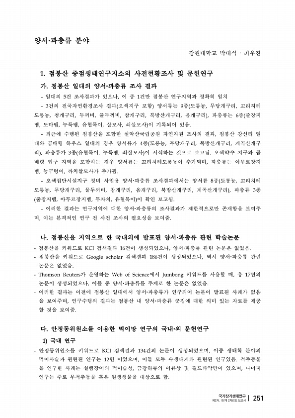 양서 파충류 분야 강원대학교 박대식 ? 최우진 점봉산 중점생태연구지소의 사전현황조사 및 문헌연구 가 점봉산 일대의 양서 파충류 조사 결과 일대의 건 조사결과가 있으나 이 중 건만 점봉산 연구지역과 정확히 일치 건의 전국자연환경조사 결과 오색지구 포함 양서류는 종 도롱뇽 무당개구리 꼬리치레 도롱뇽 청개구리 두꺼비 물두꺼비 참개구리 북방산개구리 옴개구리 파충류는 종 줄장지 뱀 도마뱀 누룩뱀 유혈목이 살모사 쇠살모사 이 기록되어 있음 최근에 수행된 점봉산을 포함한 설악산국립공원 자연자원 조사의 결과 점봉산 강선리 일 대와 곰배령 하우스 일대의 경우 양서류가 종 도롱뇽 무당개구리 북방산개구리 계곡산개구 리 파충류가 종 유혈목이 누룩뱀 쇠살모사 이 서식하는 것으로 보고됨 오색약수 지구와 곰 배령 입구 지역을 포함하는...