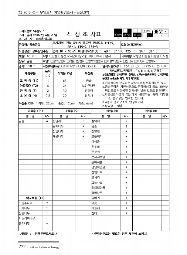 2016 전국 무인도서 자연환경조사 군산권역 272 ? National Institute of Ecology 조사표번호 주삼도-1 조사 일자 2016년 4월 20일 조 사 자 방제용,이지효 식 생 조 사표 군락명곰솔군락 조사지역전북 군산시 옥도면 무녀도리 산135, 135-1, 135-2, 135-3 도엽명 격자번호 식생상관상록침엽수림 면적10 × 10 ㎡ 위·경도 GPS 35 ° 48 ′ 07 ″N, 126 ° 24 ′ 32 ″E 해발40 m 지형□산정 □능선 ?사면 ?상?중□하 □계곡 □평지 미세지형?평면 □돌출 □함몰 □요철 방위남동 토양□갈색삼림토 □적황색삼림토 □암적색삼림토 □회갈색삼림토 □침식토 □미숙토 □암쇄토 경사10 ° 낙엽부식층 cm □≥20 ? 15 □ 10 □ 5 □0 암석노출 % □≥...