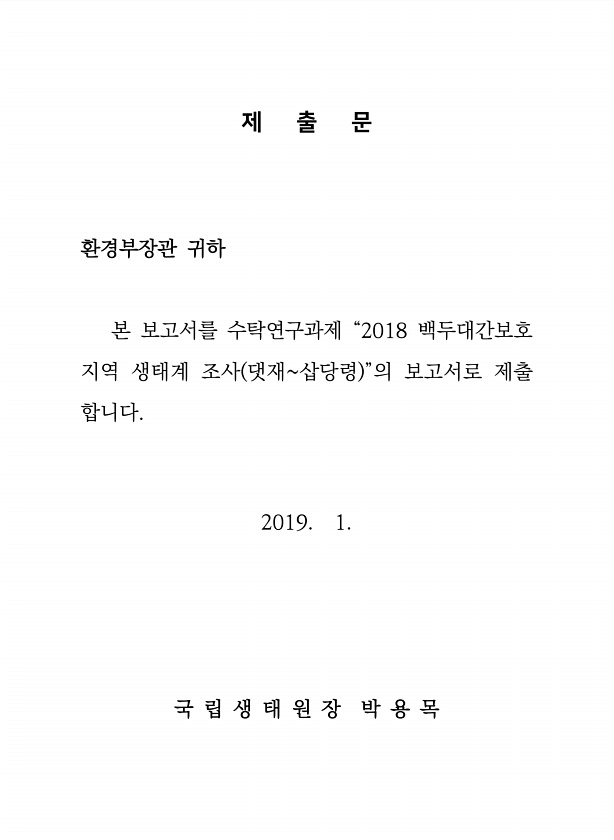 제 출 문 환경부장관 귀하 본 보고서를 수탁연구과제 “2018 백두대간보호 지역 생태계 조사 댓재삽당령 ”의 보고서로 제출 합니다. 2019. 1. 국 립 생 태 원 장 박 용목
