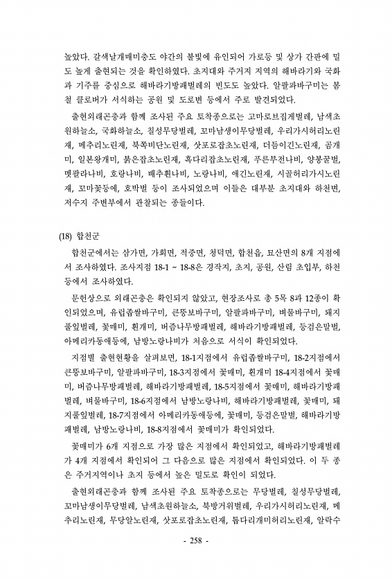 높았다. 갈색날개매미충도 야간의 불빛에 유인되어 가로등 및 상가 간판에 밀 도 높게 출현되는 것을 확인하였다. 초지대와 주거지 지역의 해바라기와 국화 과 기주를 중심으로 해바라기방패벌레의 빈도도 높았다. 알팔파바구미는 봄 철 클로버가 서식하는 공원 및 도로변 등에서 주로 발견되었다. 출현외래곤충과 함께 조사된 주요 토착종으로는 고마로브집게벌레, 남색초 원하늘소, 국화하늘소, 칠성무당벌레, 꼬마남생이무당벌레, 우리가시허리노린 재, 메추리노린재, 북쪽비단노린재, 삿포로잡초노린재, 더듬이긴노린재, 곰개 미, 일본왕개미, 붉은잡초노린재, 흑다리잡초노린재, 푸른부전나비, 양봉꿀벌, 멧팔라나비, 호랑나비, 배추흰나비, 노랑나비, 애긴노린재, 시골허리가시노린 재, 꼬마꽃등에, 호박벌 등이 조사되었으며 이들은 대부분 초지...