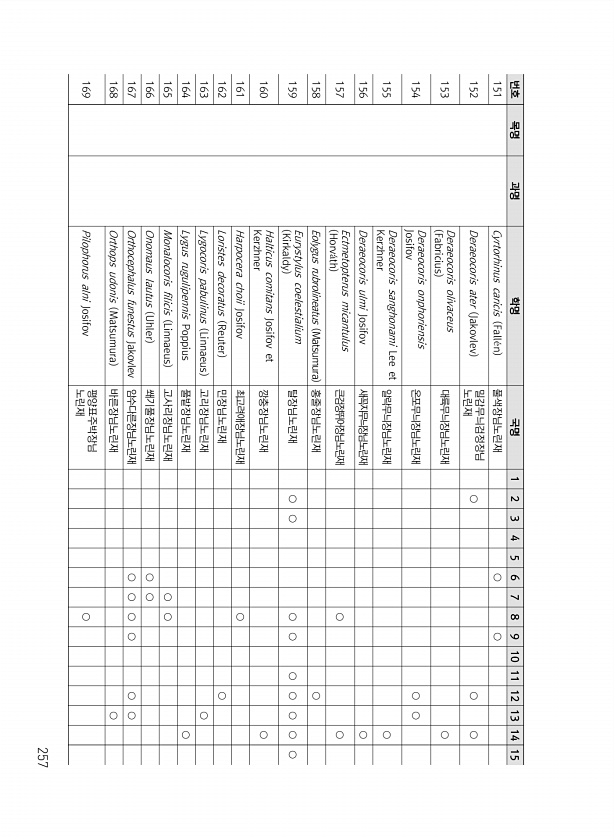 257 번호 목명 과명 학명 국명 1 2 3 4 5 6 7 8 9 10 11 12 13 14 15 151 Cyrtorhinus caricis Fall?n 풀색장님노린재 ○ ○ 152 Deraeocoris ater Jakovlev 밀감무늬검정장님 노린재 ○ ○ ○ 153 Deraeocoris olivaceus Fabricius 대륙무늬장님노린재 ○ 154 Deraeocoris onphoriensis Josifov 온포무늬장님노린재 ○ ○ 155 Deraeocoris sanghonami Lee et Kerzhner 알락무늬장님노린재 ○ 156 Deraeocoris ulmi Josifov 새꼭지무늬장님노린재 ○ 157 Ectmetopterus micantulus Horv?th 큰검정뛰어장님노린재 ○ ○ 158 E...