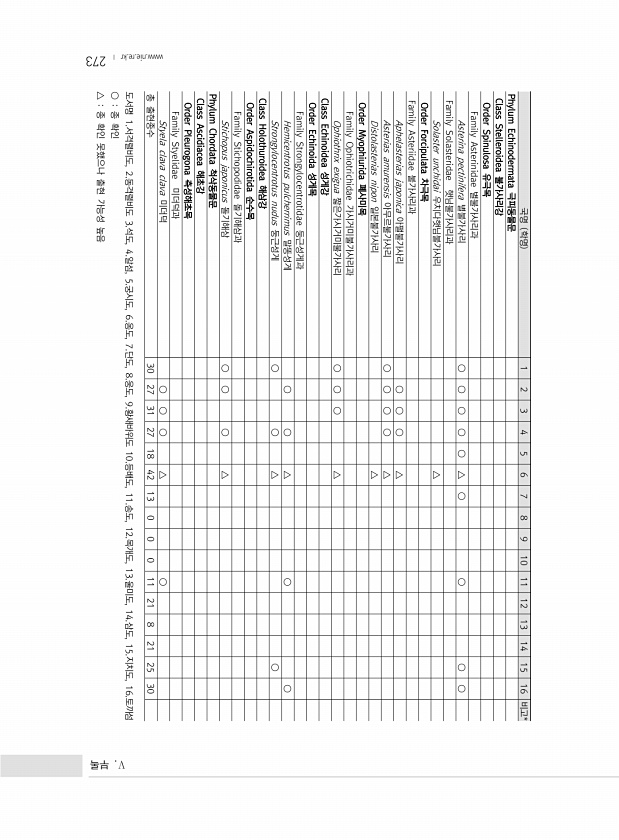 273 국명 학명 1 2 3 4 5 6 7 8 9 10 11 12 13 14 15 16 비고* Phylum Echinodermata 극피동물문 Class Stelleroidea 불가사리강 Order Spinulosa 유극목 Family Asterinidae 별불가사리과 Asterina pectinifera 별불가사리 ○ ○ ○ ○ ○ △ ○ ○ ○ ○ Family Solasteridae 햇님불가사리과 Solaster unchidai 우치다햇님불가사리 △ Order Forcipulata 차극목 Family Asteriidae 불가사리과 Aphelasterias japonica 아팰불가사리 ○ ○ ○ △ Asterias amurensis 아무르불가사리 ○ ○ ○ ○ △ Distolasterias nipon 일본...