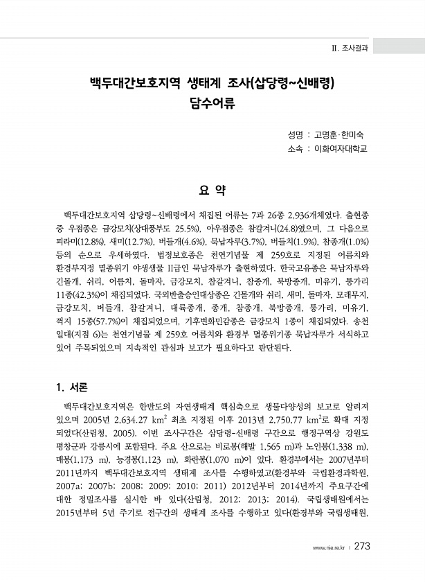 Ⅱ. 조사결과 www.nie.re.kr ? 273 백두대간보호지역 생태계 조사 삽당령신배령 담수어류 성명 고명훈·한미숙 소속 이화여자대학교 요 약 백두대간보호지역 삽당령신배령에서 채집된 어류는 7과 26종 2,936개체였다. 출현종 중 우점종은 금강모치 상대풍부도 25.5% , 아우점종은 참갈겨니 24.8 였으며, 그 다음으로 피라미 12.8% , 새미 12.7% , 버들개 4.6% , 묵납자루 3.7% , 버들치 1.9% , 참종개 1.0% 등의 순으로 우세하였다. 법정보호종은 천연기념물 제 259호로 지정된 어름치와 환경부지정 멸종위기 야생생물 II급인 묵납자루가 출현하였다. 한국고유종은 묵납자루와 긴몰개, 쉬리, 어름치, 돌마자, 금강모치, 참갈겨니, 참종개, 북방종개, 미유기, 퉁가리 11종 42.3...