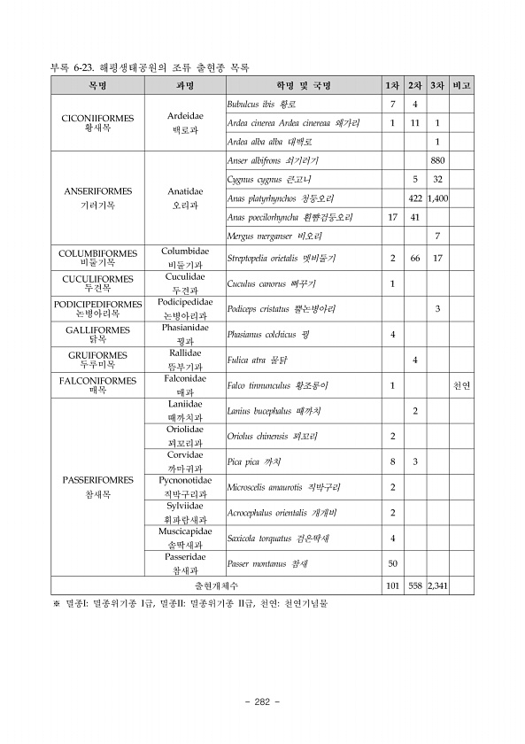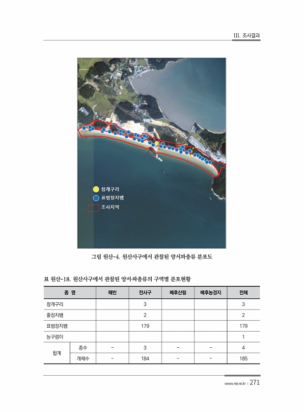 III. 조사결과 www.nie.re.kr ?271 그림 원산-4. 원산사구에서 관찰된 양서파충류 분포도 종 명 해빈 전사구 배후산림 배후농경지 전체 참개구리 3 3 줄장지뱀 2 2 표범장지뱀 179 179 능구렁이 1 합계 종수 3 4 개체수 184 185 표 원산-18. 원산사구에서 관찰된 양서?파충류의 구역별분포현황