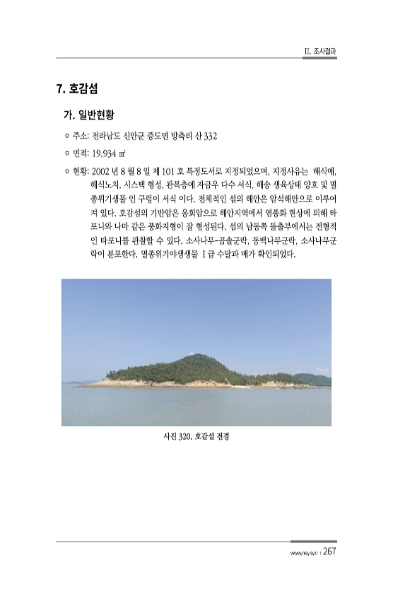 II. 조사결과 www.nie.re.kr ?267 7. ? 주소전라남도 신안군 증도면 방축리 산 332 ? 면적19,934 ㎡ ? 현황2002 년 8 월 8 일 제 101 호 특정도서로 지정되었으며, 지정사유는 해식애, 해식노치, 시스택 형성, 관목층에 자금우 다수 서식, 해송 생육상태 양호 및 멸 종위기생물 인 구렁이 서식 이다. 전체적인 섬의 해안은 암석해안으로 이루어 져 있다. 호감섬의 기반암은 응회암으로 해안지역에서 염풍화 현상에 의해 타 포니와 나마 같은 풍화지형이 잘 형성된다. 섬의 남동쪽 돌출부에서는 전형적 인 타포니를 관찰할 수 있다. 소사나무-곰솔군락, 동백나무군락, 소사나무군 락이 분포한다. 멸종위기야생생물 Ⅰ급 수달과 매가 확인되었다. 사진 320. 호감섬전경