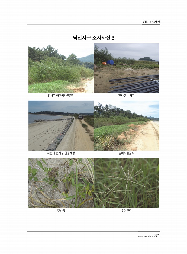 VII. 조사사진 www.nie.re.kr ?271 전사구 아까시나무군락 전사구 농경지 해빈과 전사구 인공제방 강아지풀군락 갯방풍 우산잔디3