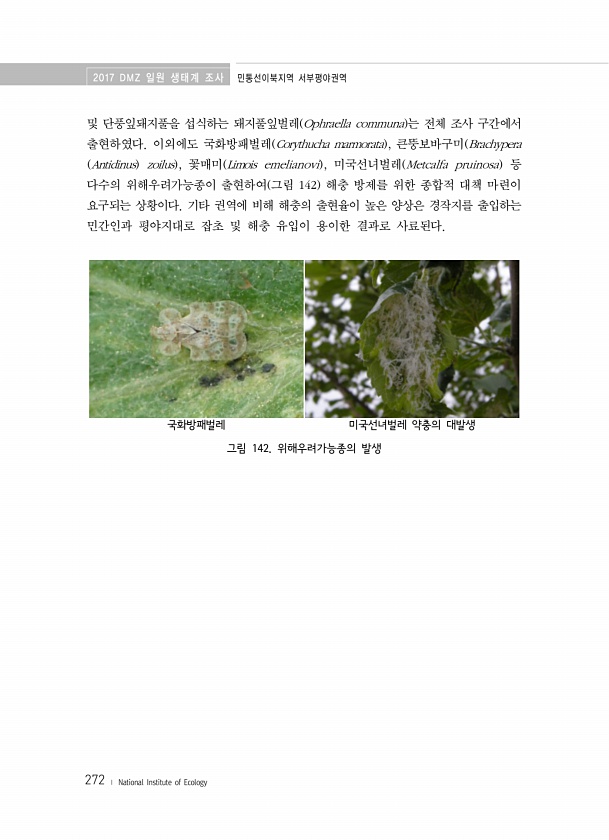 2017 DMZ 일원 생태계 조사 민통선이북지역 서부평야권역 272 ? National Institute of Ecology 및 단풍잎돼지풀을 섭식하는 돼지풀잎벌레 Ophraella communa 는 전체 조사 구간에서 출현하였다. 이외에도 국화방패벌레 Corythucha marmorata , 큰뚱보바구미 Brachypera Antidinus zoilus , 꽃매미 Limois emelianovi , 미국선녀벌레 Metcalfa pruinosa 등 다수의 위해우려가능종이 출현하여 그림 142 해충 방제를 위한 종합적 대책 마련이 요구되는 상황이다. 기타 권역에 비해 해충의 출현율이 높은 양상은 경작지를 출입하는 민간인과 평야지대로 잡초 및 해충 유입이 용이한 결과로 사료된다. 국화방패벌레 미국선녀벌레 약충의...