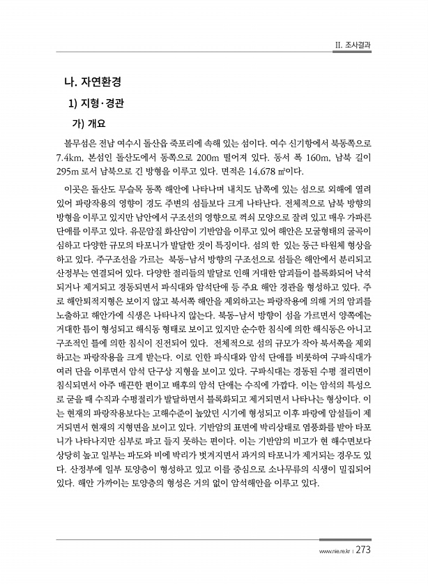 II. 조사결과 www.nie.re.kr ?273 1 · 볼무섬은 전남 여수시 돌산읍 죽포리에 속해 있는 섬이다. 여수 신기항에서 북동쪽으로 7.4km, 본섬인 돌산도에서 동쪽으로 200m 떨어져 있다. 동서 폭 160m, 남북 길이 295m 로서 남북으로 긴 방형을 이루고 있다. 면적은 14,678 ㎡이다. 이곳은 돌산도 무슬목 동쪽 해안에 나타나며 내치도 남쪽에 있는 섬으로 외해에 열려 있어 파랑작용의 영향이 경도 주변의 섬들보다 크게 나타난다. 전체적으로 남북 방향의 방형을 이루고 있지만 남안에서 구조선의 영향으로 꺽쇠 모양으로 잘려 있고 매우 가파른 단애를 이루고 있다. 유문암질 화산암이 기반암을 이루고 있어 해안은 모굴형태의 굴곡이 심하고 다양한 규모의 타포니가 발달한 것이 특징이다. 섬의 한 있는...