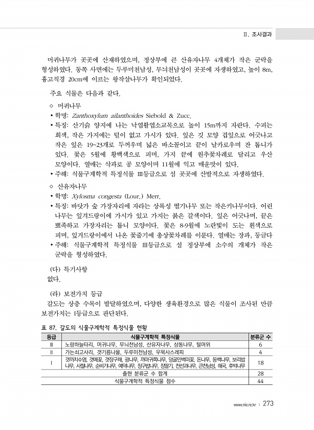 Ⅱ. 조사결과 www.nie.re.kr ? 273 머귀나무가 곳곳에 산재하였으며, 정상부에 큰 산유자나무 4개체가 작은 군락을 형성하였다. 동쪽 사면에는 두루미천남성, 무늬천남성이 곳곳에 자생하였고, 높이 8m, 흉고직경 20cm에 이르는 왕작살나무가 확인되었다. 주요 식물은 다음과 같다. ◇ 머귀나무 ? 학명Zanthoxylum ailanthoides Siebold & Zucc. ? 특징산기슭 양지에 나는 낙엽활엽소교목으로 높이 15m까지 자란다. 수피는 회색, 작은 가지에는 털이 없고 가시가 있다. 잎은 깃 모양 겹잎으로 어긋나고 작은 잎은 1923개로 두꺼우며 넓은 바소꼴이고 끝이 날카로우며 잔 톱니가 있다. 꽃은 5월에 황백색으로 피며, 가지 끝에 원추꽃차례로 달리고 우산 모양이다. 열매는 삭과로 공...