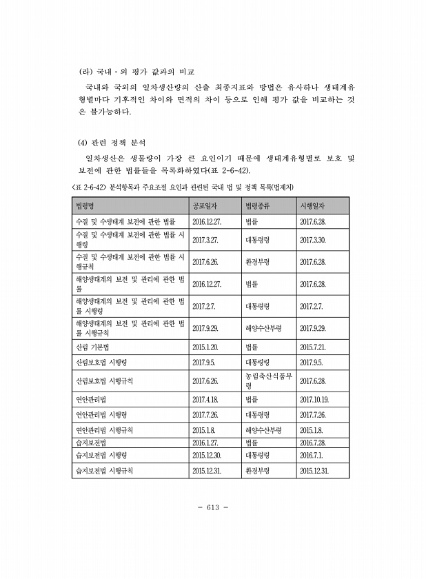 613 법령명 공포일자 법령종류 시행일자 수질 및 수생태계 보전에 관한 법률 2016.12.27. 법률 2017.6.28. 수질 및 수생태계 보전에 관한 법률 시 행령 2017.3.27. 대통령령 2017.3.30. 수질 및 수생태계 보전에 관한 법률 시 행규칙 2017.6.26. 환경부령 2017.6.28. 해양생태계의 보전 및 관리에 관한 법 률 2016.12.27. 법률 2017.6.28. 해양생태계의 보전 및 관리에 관한 법 률 시행령 2017.2.7. 대통령령 2017.2.7. 해양생태계의 보전 및 관리에 관한 법 률 시행규칙 2017.9.29. 해양수산부령 2017.9.29. 산림 기본법 2015.1.20. 법률 2015.7.21. 산림보호법 시행령 2017.9.5. 대통령령 2017.9.5. 산...