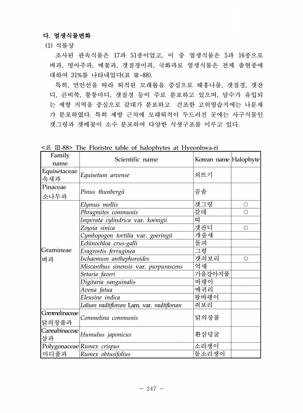 247 다. 염생식물변화 1 식물상 조사된 관속식물은 17과 51종이었고, 이 중 염생식물은 5과 16종으로 벼과, 명아주과, 메꽃과, 갯질경이과, 국화과로 염생식물은 전체 출현종에 대하여 31%를 나타내었다 표 Ⅲ-88 특히, 연안선을 따라 퇴적된 모래톱을 중심으로 해홍나물, 갯질경, 갯잔 디, 큰비쑥, 퉁퉁마디, 갯질경 등이 주로 분포하고 있으며, 담수가 유입되 는 제방 지역을 중심으로 갈대가 분포하고 건조한 고위염습지에는 나문재 가 분포하였다. 특히 제방 근처에 모래퇴적이 두드러진 곳에는 사구식물인 갯그령과 갯메꽃이 소수 분포하여 다양한 식생구조를 이루고 있다. 표 Ⅲ-88 The Floristre table of halophytes at Hyeonhwa-ri Family name Scientific ...