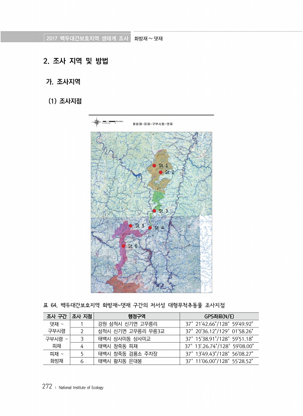 2017 백두대간보호지역 생태계 조사 화방재 댓재 272 ? National Institute of Ecology 2. 조사 지역 및 방법 가. 조사지역 1 조사지점 조사 구간 조사 지점 행정구역 GPS좌표 N/E 댓재 구부시령 1 강원 삼척시 신기면 고무릉리 37°2142.66/128°5949.922 삼척시 신기면 고무릉리 무릉3교 37°2036.12/129°0158.26구부시령 피재 3 태백시 상사미동 상사미교 37°1538.91/128°5951.184 태백시 창죽동 피재 37°13.26.74/128°5908.00피재 화방재 5 태백시 창죽동 검룡소 주차장 37°1349.43/128°5608.276 태백시 황지동 은대봉 37°1106.00/128°5528.52표 64. 백두대간보호지역 화방재댓재 구간의 ...