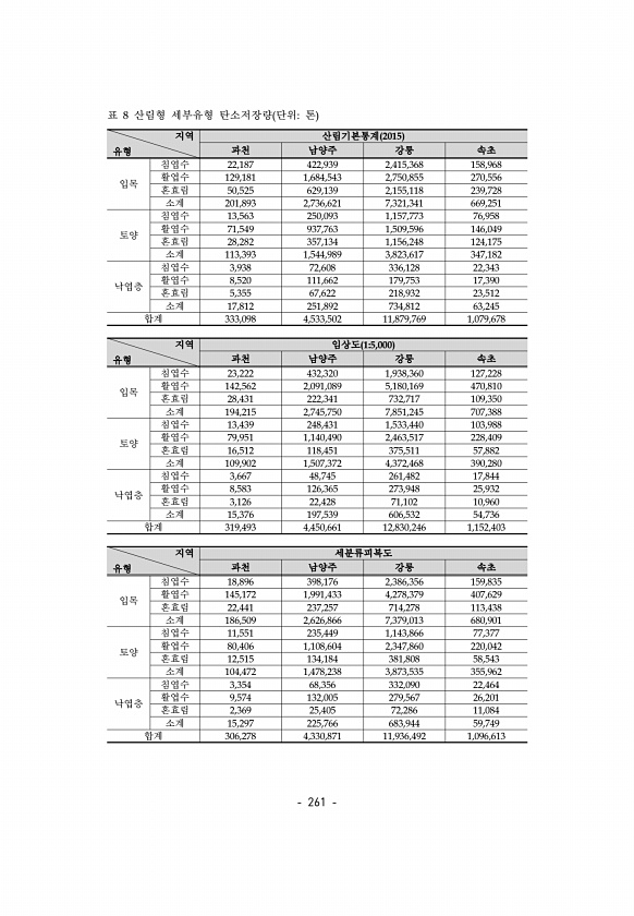 261 지역 유형 산림기본통계 2015 과천 남양주 강릉 속초 입목 침엽수 22,187 422,939 2,415,368 158,968 활엽수 129,181 1,684,543 2,750,855 270,556 혼효림 50,525 629,139 2,155,118 239,728 소계 201,893 2,736,621 7,321,341 669,251 토양 침엽수 13,563 250,093 1,157,773 76,958 활엽수 71,549 937,763 1,509,596 146,049 혼효림 28,282 357,134 1,156,248 124,175 소계 113,393 1,544,989 3,823,617 347,182 낙엽층 침엽수 3,938 72,608 336,128 22,343 활엽수 8,520 111,662 179...