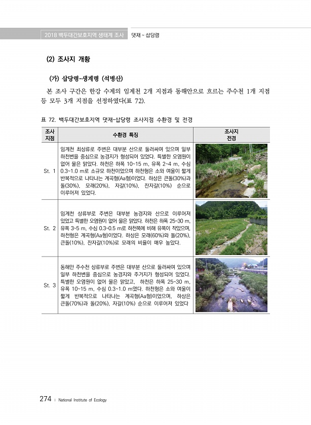 2018 백두대간보호지역 생태계 조사 댓재 삽당령 274 ? National Institute of Ecology 2 조사지 개황 가 삽당령-생계령 석병산 본 조사 구간은 한강 수계의 임계천 2개 지점과 동해안으로 흐르는 주수천 1개 지점 등 모두 3개 지점을 선정하였다 표 72 표 72. 백두대간보호지역 댓재-삽당령 조사지점 수환경 및 전경 조사 지점 수환경 특징 조사지 전경 St. 1 임계천 최상류로 주변은 대부분 산으로 둘러싸여 있으며 일부 하천변을 중심으로 농경지가 형성되어 있었다. 특별한 오염원이 없어 물은 맑았다. 하천은 하폭 1015 m, 유폭 24 m, 수심 0.31.0 m로 소규모 하천이었으며 하천형은 소와 여울이 짧게 반복적으로 나타나는 계곡형 Aa형 이었다. 하상은 큰돌 30% 과 돌 3...