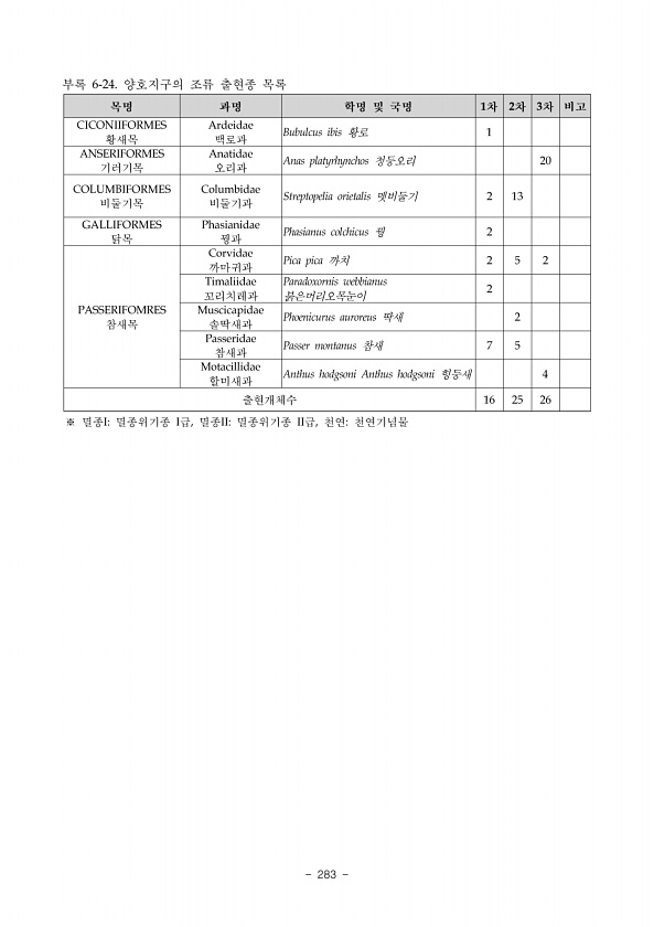 2018 전국해안사구 자연환경조사 충남 272 ? National Institute of Ecology 6 총 2 회의 조사를 통해 원산사구에서 확인된 조류는 아종을 구분하여 총 36 종 317 개 체가 관찰되었으며, 1 차 조사결과 총 29 종 79 개체가 확인되었다. 이를 서식지 유형별 로 보면, 해빈에서는 13 종 213 개체, 배후산림에서는 23 종 94 개체, 초본에서는 3 종 10 개체가 나타났다 표 원산-19 전체 주요 우점종은 괭이갈매기 46.69% 로 나타났으 며, 그 다음으로 방울새 7.26% , 중부리도요 6.94% , 참새 5.68% 순, 1 차 조사결과 주 요 우점종은 방울새 18.99% 로 나타났으며, 그 다음으로 흰물떼새 11.39% , 붉은머리 오목눈이 10.13% , 참새 8....