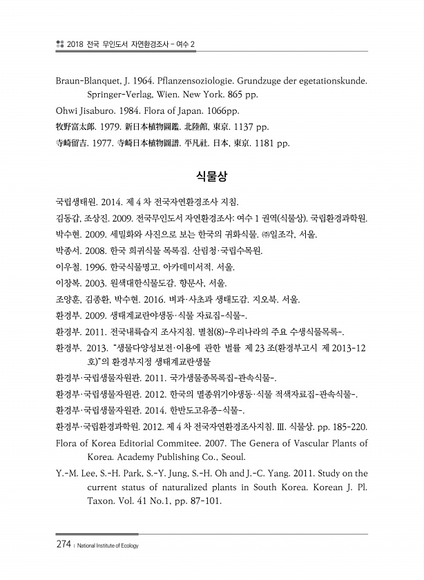 2018 전국 무인도서 자연환경조사 여수 2 274 ? National Institute of Ecology Braun-Blanquet, J. 1964. Pflanzensoziologie. Grundzuge der egetationskunde. Springer-Verlag, Wien. New York. 865 pp. Ohwi Jisaburo. 1984. Flora of Japan. 1066pp. 牧野富太郞. 1979. 新日本植物圖鑑. 北陸館, 東京. 1137 pp. 寺崎留吉. 1977. 寺崎日本植物圖譜. 平凡社. 日本, 東京. 1181 pp. 국립생태원. 2014. 제 4 차 전국자연환경조사 지침. 김동갑, 조상진. 2009. 전국무인도서 자연환경조사여수 1 권역 식물상 국립환경과학원. 박수현. 2009. ...