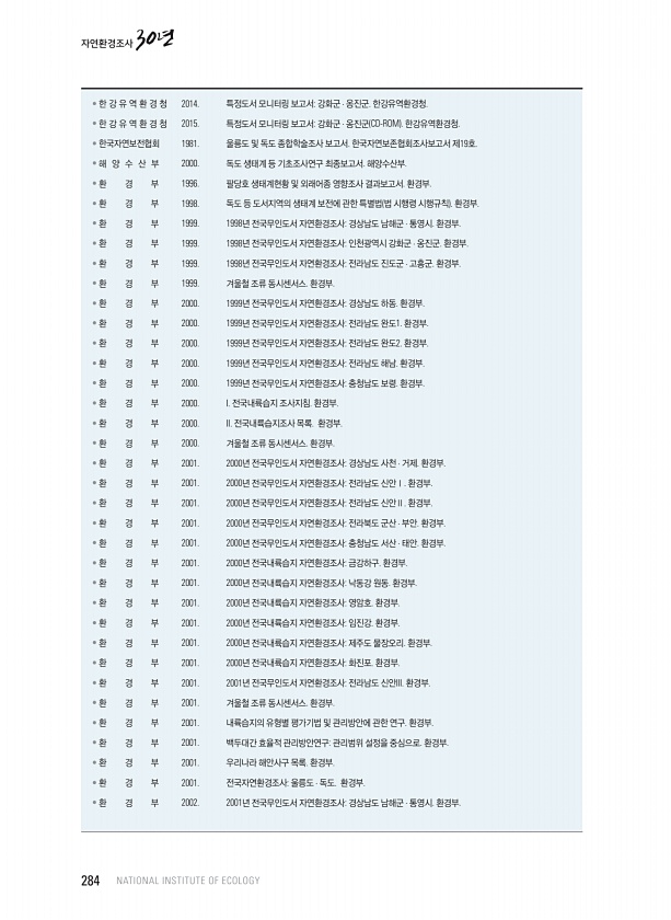 ? 한 강 유 역 환 경 청 2014. 특정도서 모니터링 보고서강화군 · 옹진군. 한강유역환경청. ? 한 강 유 역 환 경 청 2015. 특정도서 모니터링 보고서강화군 · 옹진군 CD-ROM 한강유역환경청. ? 한국자연보전협회 1981. 울릉도 및 독도 종합학술조사 보고서. 한국자연보존협회조사보고서 제19호. ? 해 양 수 산 부 2000. 독도 생태계 등 기초조사연구 최종보고서. 해양수산부. ? 환 경 부 1996. 팔당호 생태계현황 및 외래어종 영향조사 결과보고서. 환경부. ? 환 경 부 1998. 독도 등 도서지역의 생태계 보전에 관한 특별법 법 시행령 시행규칙 환경부. ? 환 경 부 1999. 1998년 전국무인도서 자연환경조사경상남도 남해군 · 통영시. 환경부. ? 환 경 부 1999. 1998년 ...