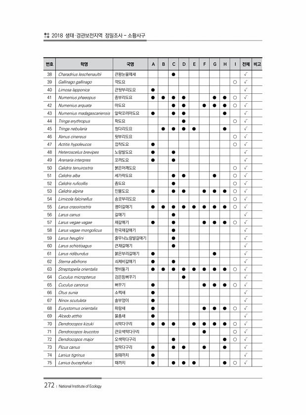 2018 생태·경관보전지역 정밀조사 소황사구 272 ? National Institute of Ecology 번호 학명 국명 A B C D E F G H I 전체 비고 38 Charadrius leschenaultii 큰왕눈물떼새 ● √ 39 Gallinago gallinago 꺅도요 ○ √ 40 Limosa lapponica 큰뒷부리도요 ● √ 41 Numenius phaeopus 중부리도요 ● ● ● ● ● ● ○ √ 42 Numenius arquata 마도요 ● ● ● ● ● ○ √ 43 Numenius madagascariensis 알락꼬리마도요 ● ● ● ● √ 44 Tringa erythropus 학도요 ● ○ √ 45 Tringa nebularia 청다리도요 ● ● ● ● ● √ 46 Xenus...