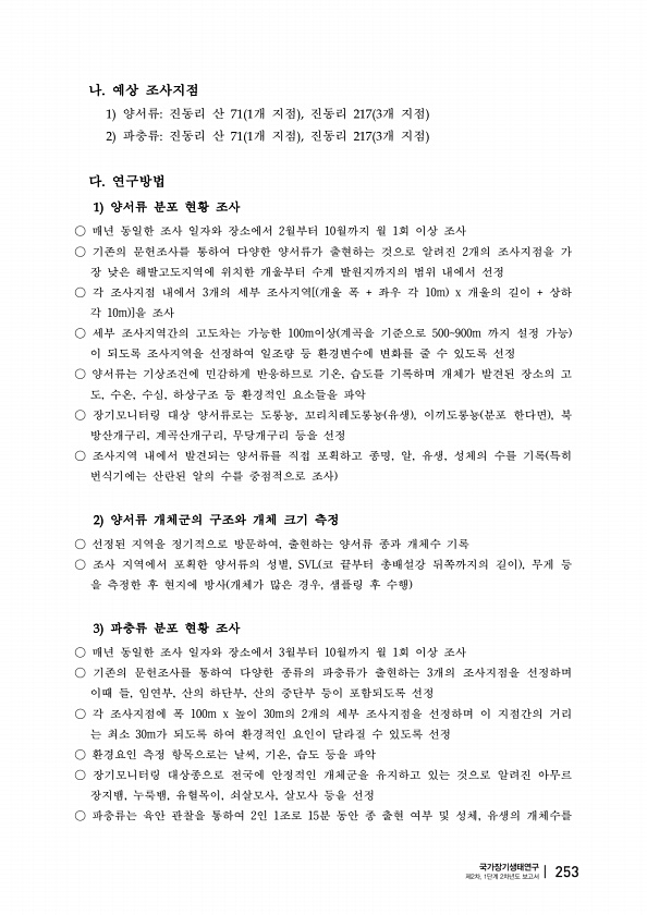 나 예상 조사지점 양서류 진동리 산 개 지점 진동리 개 지점 파충류 진동리 산 개 지점 진동리 개 지점 다 연구방법 양서류 분포 현황 조사 ○ 매년 동일한 조사 일자와 장소에서 2월부터 10월까지 월 1회 이상 조사 ○ 기존의 문헌조사를 통하여 다양한 양서류가 출현하는 것으로 알려진 2개의 조사지점을 가 장 낮은 해발고도지역에 위치한 개울부터 수계 발원지까지의 범위 내에서 선정 ○ 각 조사지점 내에서 3개의 세부 조사지역[ 개울 폭 + 좌우 각 10m x 개울의 길이 + 상하 각 10m ]을 조사 ○ 세부 조사지역간의 고도차는 가능한 100m이상 계곡을 기준으로 500900m 까지 설정 가능 이 되도록 조사지역을 선정하여 일조량 등 환경변수에 변화를 줄 수 있도록 선정 ○ 양서류는 기상조건에 민감하게 반응하...