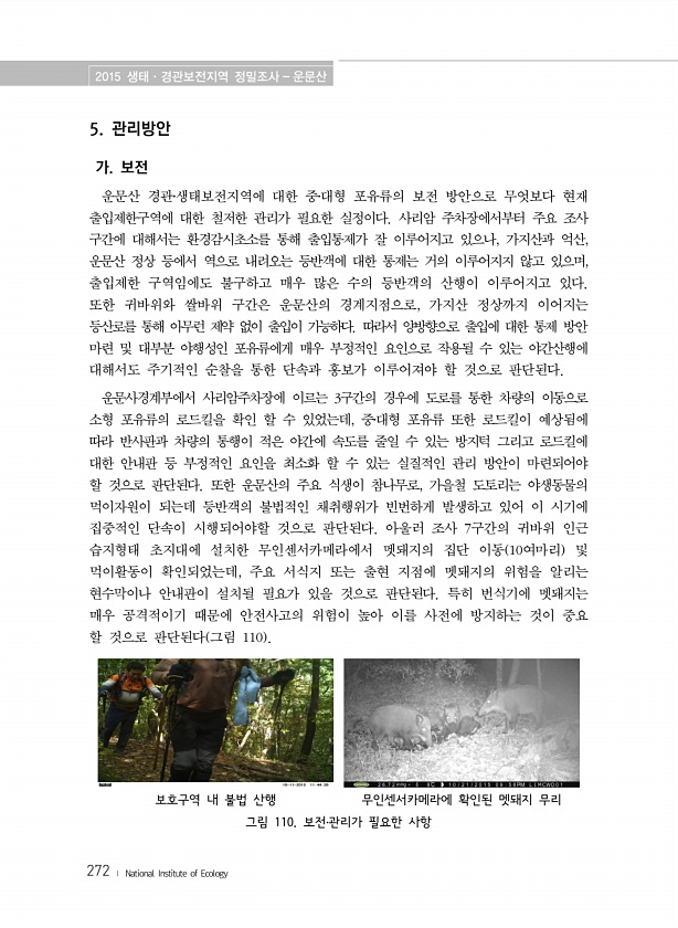 2015 생태·경관보전지역 정밀조사 운문산 272 ? National Institute of Ecology 5. 관리방안 가. 보전 운문산 경관?생태보전지역에 대한 중?대형 포유류의 보전 방안으로 무엇보다 현재 출입제한구역에 대한 철저한 관리가 필요한 실정이다. 사리암 주차장에서부터 주요 조사 구간에 대해서는 환경감시초소를 통해 출입통제가 잘 이루어지고 있으나, 가지산과 억산, 운문산 정상 등에서 역으로 내려오는 등반객에 대한 통제는 거의 이루어지지 않고 있으며, 출입제한 구역임에도 불구하고 매우 많은 수의 등반객의 산행이 이루어지고 있다. 또한 귀바위와 쌀바위 구간은 운문산의 경계지점으로, 가지산 정상까지 이어지는 등산로를 통해 아무런 제약 없이 출입이 가능하다. 따라서 양방향으로 출입에 대한 통제 방안 ...