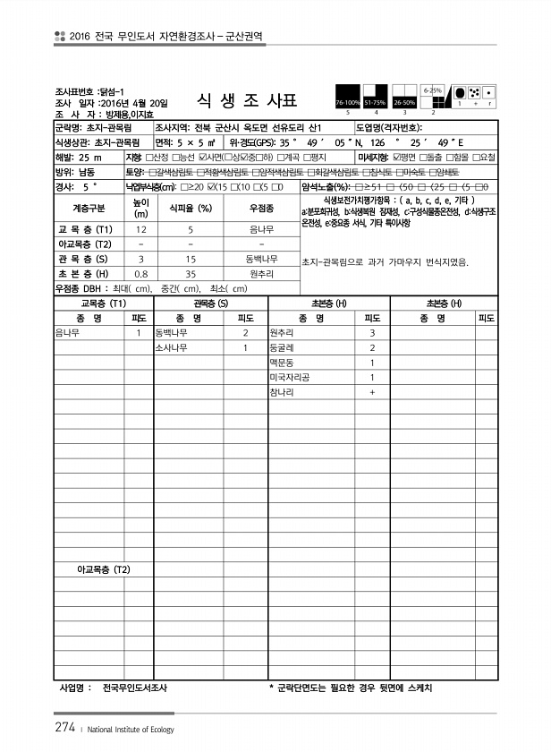 2016 전국 무인도서 자연환경조사 군산권역 274 ? National Institute of Ecology 조사표번호 닭섬-1 조사 일자 2016년 4월 20일 조 사 자 방제용,이지효 식 생 조 사표 군락명초지-관목림 조사지역전북 군산시 옥도면 선유도리 산1 도엽명 격자번호 식생상관초지-관목림 면적5 × 5 ㎡ 위·경도 GPS 35 ° 49 ′ 05 ″N, 126 ° 25 ′ 49 ″E 해발25 m 지형□산정 □능선 ?사면 ?상?중□하 □계곡 □평지 미세지형?평면 □돌출 □함몰 □요철 방위남동 토양□갈색삼림토 □적황색삼림토 □암적색삼림토 □회갈색삼림토 □침식토 □미숙토 □암쇄토 경사5 ° 낙엽부식층 cm □≥20 ? 15 □ 10 □ 5 □0 암석노출 % □≥51 □〈50 □〈25 □〈5 □0 계층구분 ...