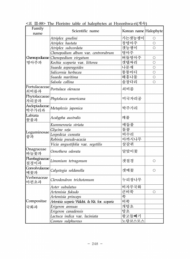 248 표 Ⅲ-88 The Floristre table of halophytes at Hyeonhwa-ri 계속 Family name Scientific name Korean name Halophyte Chennopodiaceae 명아주과 Atriplex gmelini 가는갯능쟁이 ○ Atriplex hastata 창명아주 ○ Atriplex subcordata 갯능쟁이 ○ Chenopodium album var. centrorubrum 명아주 Chenopodium virgatum 버들명아주 ○ Kochia scoparia var. littorea 갯댑싸리 ○ Suaeda asparagoides 나문재 ○ Salicornia herbacea 퉁퉁마디 ○ Suaeda maritima 해홍나물 ○ Salsola...