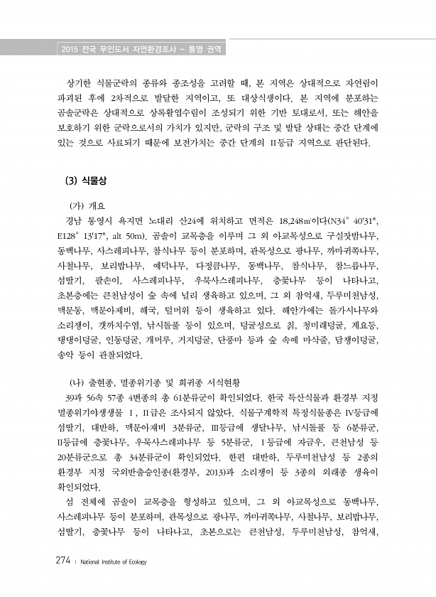 2015 전국 무인도서 자연환경조사 통영 권역 274 ? National Institute of Ecology 상기한 식물군락의 종류와 종조성을 고려할 때, 본 지역은 상대적으로 자연림이 파괴된 후에 2차적으로 발달한 지역이고, 또 대상식생이다. 본 지역에 분포하는 곰솔군락은 상대적으로 상록활엽수림이 조성되기 위한 기반 토대로서, 또는 해안을 보호하기 위한 군락으로서의 가치가 있지만, 군락의 구조 및 발달 상태는 중간 단계에 있는 것으로 사료되기 때문에 보전가치는 중간 단계의 Ⅱ등급 지역으로 판단된다. 3 식물상 가 개요 경남 통영시 욕지면 노대리 산24에 위치하고 면적은 18,248㎡이다 N34°4031, E128°1317, alt 50m 곰솔이 교목층을 이루며 그 외 아교목성으로 구실잣밤나무, 동백나무,...