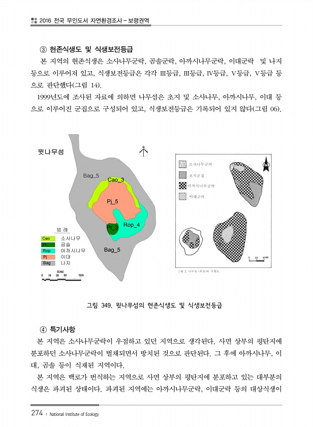 2016 전국 무인도서 자연환경조사 보령권역 274 ? National Institute of Ecology ③ 현존식생도 및 식생보전등급 본 지역의 현존식생은 소사나무군락, 곰솔군락, 아까시나무군락, 이대군락 및 나지 등으로 이루어져 있고, 식생보전등급은 각각 Ⅲ등급, Ⅲ등급, Ⅳ등급, Ⅴ등급, Ⅴ등급 등 으로 판단했다 그림 14 1999년도에 조사된 자료에 의하면 나무섬은 초지 및 소사나무, 아까시나무, 이대 등 으로 이루어진 군집으로 구성되어 있고, 식생보전등급은 기록되어 있지 않다 그림 06 그림 349. 윗나무섬의 현존식생도 및 식생보전등급 ④ 특기사항 본 지역은 소사나무군락이 우점하고 있던 지역으로 생각된다. 사면 상부의 평탄지에 분포하던 소사나무군락이 벌채되면서 방치된 것으로 판단된다. 그 후에...