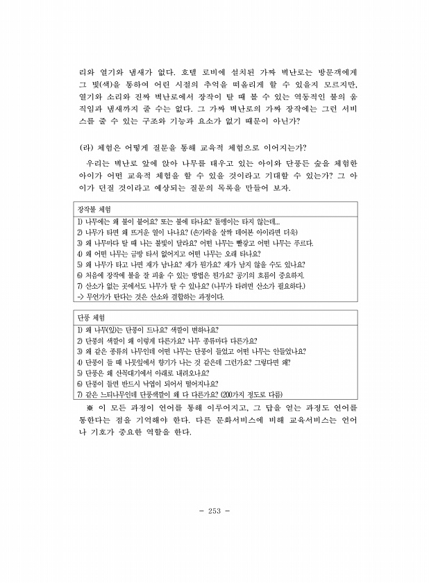 253 리와 열기와 냄새가 없다. 호텔 로비에 설치된 가짜 벽난로는 방문객에게 그 빛 색 을 통하여 어린 시절의 추억을 떠올리게 할 수 있을지 모르지만, 열기와 소리와 진짜 벽난로에서 장작이 탈 때 볼 수 있는 역동적인 불의 움 직임과 냄새까지 줄 수는 없다. 그 가짜 벽난로의 가짜 장작에는 그런 서비 스를 줄 수 있는 구조와 기능과 요소가 없기 때문이 아닌가? 라 체험은 어떻게 질문을 통해 교육적 체험으로 이어지는가? 우리는 벽난로 앞에 앉아 나무를 태우고 있는 아이와 단풍든 숲을 체험한 아이가 어떤 교육적 체험을 할 수 있을 것이라고 기대할 수 있는가? 그 아 이가 던질 것이라고 예상되는 질문의 목록을 만들어 보자. 장작불 체험 1 나무에는 왜 불이 붙어요? 또는 불에 타나요? 돌멩이는 타지 않는데......