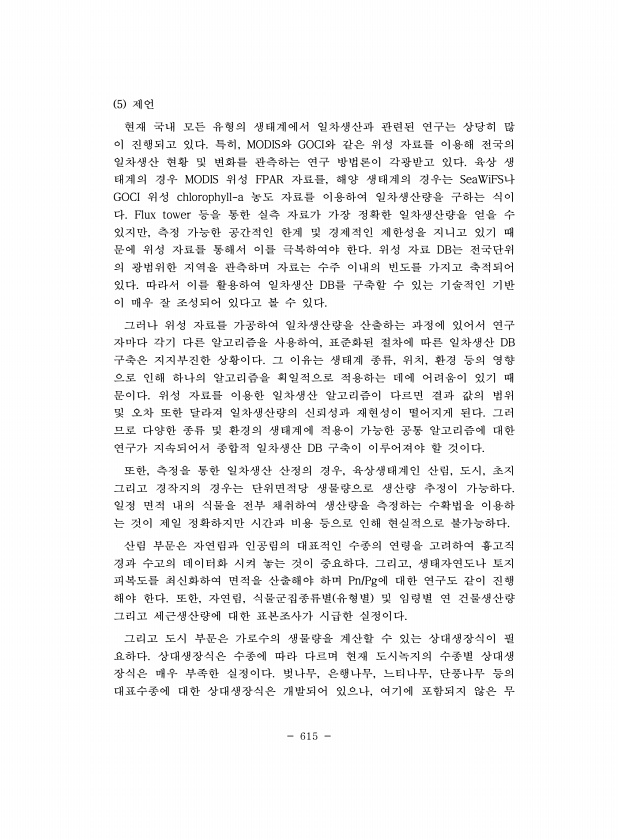 615 5 제언 현재 국내 모든 유형의 생태계에서 일차생산과 관련된 연구는 상당히 많 이 진행되고 있다. 특히, MODIS와 GOCI와 같은 위성 자료를 이용해 전국의 일차생산 현황 및 변화를 관측하는 연구 방법론이 각광받고 있다. 육상 생 태계의 경우 MODIS 위성 FPAR 자료를, 해양 생태계의 경우는 SeaWiFS나 GOCI 위성 chlorophyll-a 농도 자료를 이용하여 일차생산량을 구하는 식이 다. Flux tower 등을 통한 실측 자료가 가장 정확한 일차생산량을 얻을 수 있지만, 측정 가능한 공간적인 한계 및 경제적인 제한성을 지니고 있기 때 문에 위성 자료를 통해서 이를 극복하여야 한다. 위성 자료 DB는 전국단위 의 광범위한 지역을 관측하며 자료는 수주 이내의 빈도를 가지고 축적되어 있...