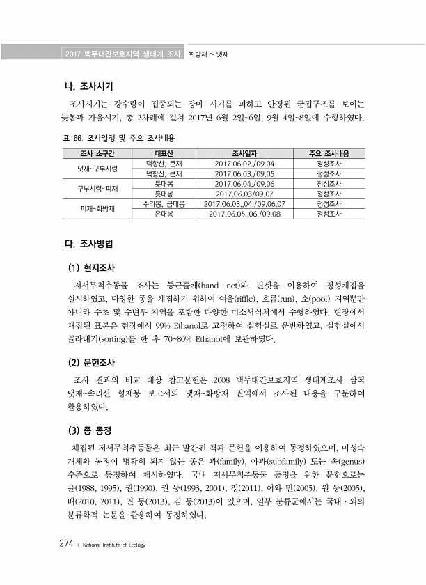 2017 백두대간보호지역 생태계 조사 화방재 댓재 274 ? National Institute of Ecology 나. 조사시기 조사시기는 강수량이 집중되는 장마 시기를 피하고 안정된 군집구조를 보이는 늦봄과 가을시기, 총 2차례에 걸쳐 2017년 6월 2일6일, 9월 4일8일에 수행하였다. 조사 소구간 대표산 조사일자 주요 조사내용 댓재구부시령 덕항산, 큰재 2017.06.02./09.04 정성조사 덕항산, 큰재 2017.06.03./09.05 정성조사 구부시령피재 푯대봉 2017.06.04./09.06 정성조사 푯대봉 2017.06.03/09.07 정성조사 피재화방재 수리봉, 금대봉 2017.06.03.,04./09.06,07 정성조사 은대봉 2017.06.05.,06./09.08 정성조사 표 66. 조...