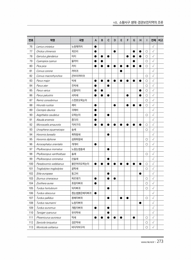 vii. 소황사구 생태·경관보전지역의 조류 www.nie.re.kr ?273 번호 학명 국명 A B C D E F G H I 전체 비고 76 Lanius cristatus 노랑때까치 ● √ 77 Oriolus chinensis 꾀꼬리 ● ● ● ● ○ √ 78 Garrulus glandarius 어치 ● ● ● ● ● ● ○ √ 79 Cyanopica cyanus 물까치 ● ● ● ○ √ 80 Pica pica 까치 ● ● ● ● ● ● ● ● ○ √ 81 Corvus corone 까마귀 ● √ 82 Corvus macrorhynchos 큰부리까마귀 ○ √ 83 Parus major 박새 ● ● ● ● ● ● ● ● ○ √ 84 Parus ater 진박새 ● ● ○ √ 85 Parus varius 곤줄박이 ...